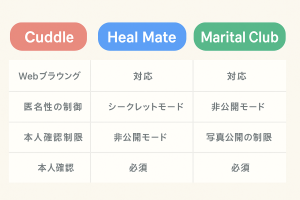 | 項目 | カドル | ヒールメイト | 既婚者クラブ |